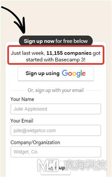 你甚至可以學(xué)習 Basecamp 平臺,通過(guò)文案說(shuō)明來(lái)告訴用戶(hù)「僅僅過(guò)去的一周就有 11555 家公司在使用 Basecamp」。以此來(lái)提升用戶(hù)對產(chǎn)品的信任感,增加用戶(hù)注冊的轉化率。